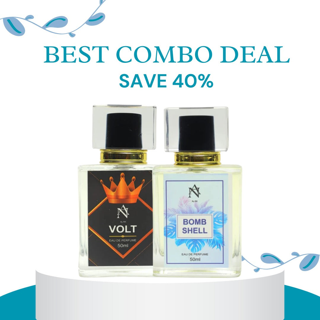 Combo Deal – Volt + Bomb Shell (50ml each) Experience the perfect balance of energy and elegance with our Volt and Bomb Shell combo. Volt brings a bold, electrifying freshness, while Bomb Shell adds an irresistible charm. Together, they create the ultimate fragrance duo for every occasion.